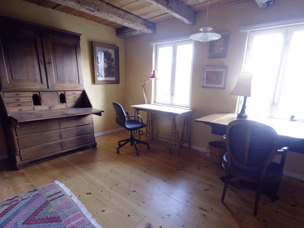The Leif Hasle room contains everything you need for a writing retreat. It is named after Leif Hasle and, like the rest of the residency, is furnished with pieces from his large collection of antiques. There is a good workspace, and wherever you sit, you will always have a view of the beautiful garden.